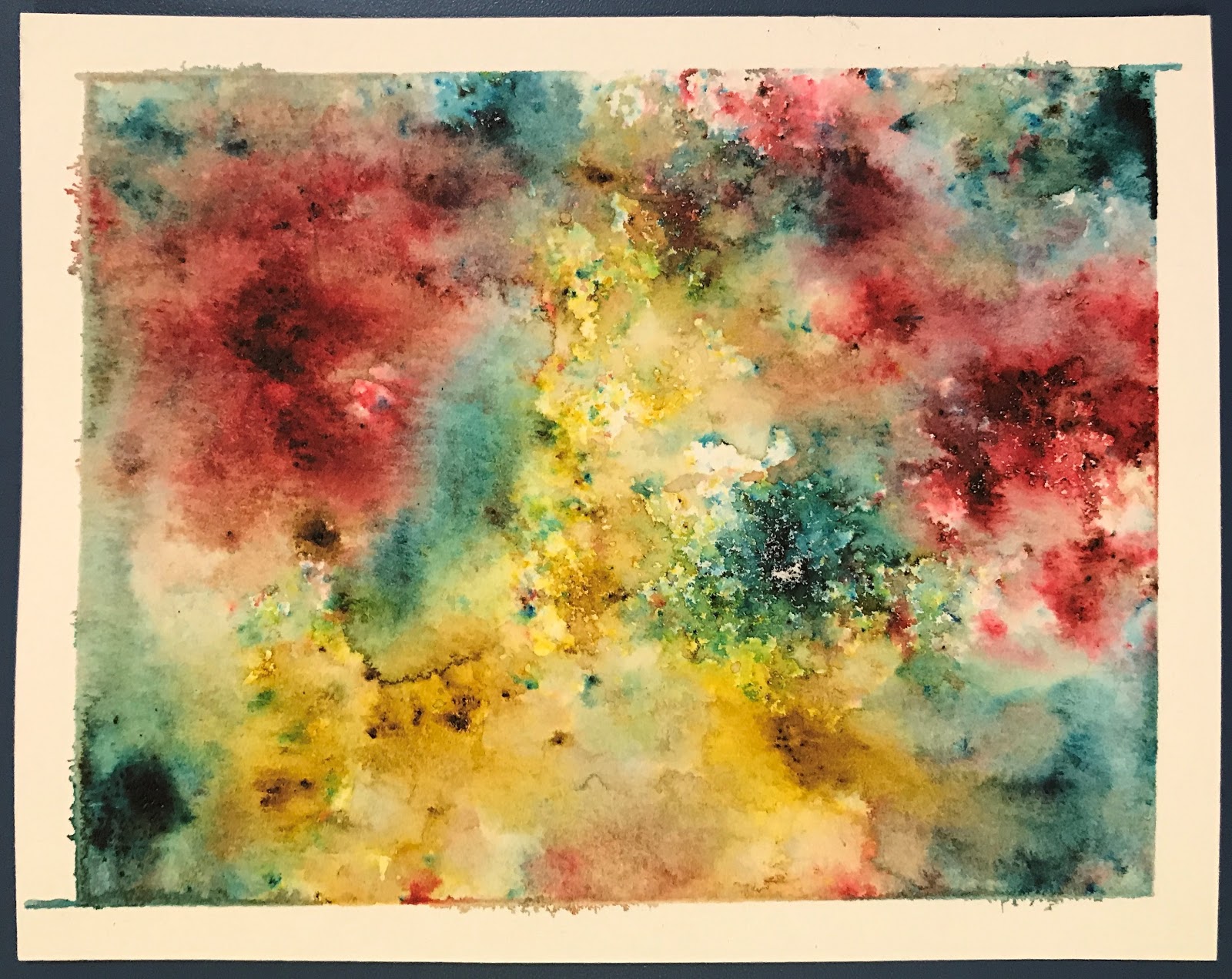 Then I tried something that I thought would be neat.....FAILURE. I put some of the Bister crystals on my watercolor paper, covered it with a damp paper towel and then misted it more. The paper towel looked pretty cool...for a while. I finally lifted it to look at the paper beneath. It looked like I had done nothing. Hmmmm. So, I just misted it like normal and that is the red/yellow/blue sample. Think I'll stamp a silhouette stamp in it.