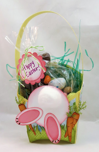 My friend in Washington, Cindy Tschider, made these awesomely cute Easter Bunny baskets. The moment I saw them, I knew I had to make some for my 5 grandkids. I hope that they enjoy the little bunny bottoms! Each basket has a chocolate bunny, Whopper eggs and some Jelly Belly jelly beans. That and......Easter Grass!! I'm quite glad that the Easter grass will be at their house and not mine! I remember when my kids were little. That grass seemed to pop up for weeks in the strangest places. The feet were punched with oval Stampin Up punches. The body was a Spellbinders die. The Easter tag was made from SU punches. I designed the carrots myself and cut them out with my Portrait machine. The top of the carrot is a fern punch from Martha Stewart. The French Fry box was cut on my Silhouette Portrait machine and was a file from their store. The grass was also a cut file from the Silhouette store. It is a little hard to see because there isn't a shadow under it but the bunny's tail is a cotton ball. I cut the cotton balls in half to make them just a little smaller. My friend's box didn't have a handle but I felt it needed it.