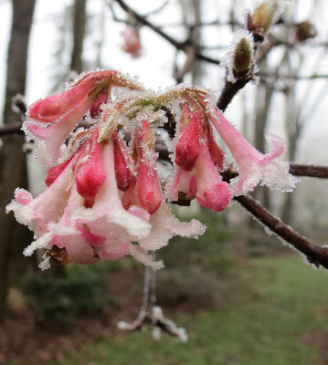 The last couple of days have been soooo pretty outside. We have been fogged in for several days but it has been cold enough that the fog has been freezing on trees and plants. We went around and took hundreds of photos around the house. Here are a couple for your enjoyment! The first flower is Vibunum Bodnantense. It always blooms all December into January. The whole bunch of flowers is about 1.5 in in diameter.